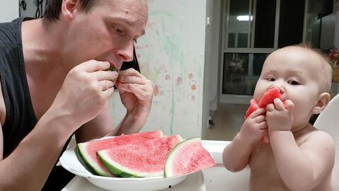 我们找了个舒适的地方坐下,爸爸拿起一个西瓜,用刀子轻轻一划,西瓜裂成了两半。他递给我一半,自己拿起了另一半。我们俩一边吃瓜,一边聊着天,那感觉,就像是回到了小时候。